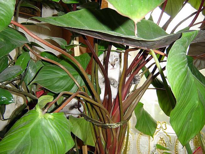 Yes, a good comparison. Aroids are almost as beautiful as cats:)The photo attached shows my Luna hiding in the jungle of Homalomena rubescens :)