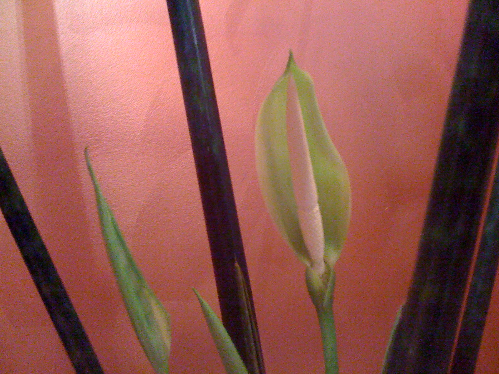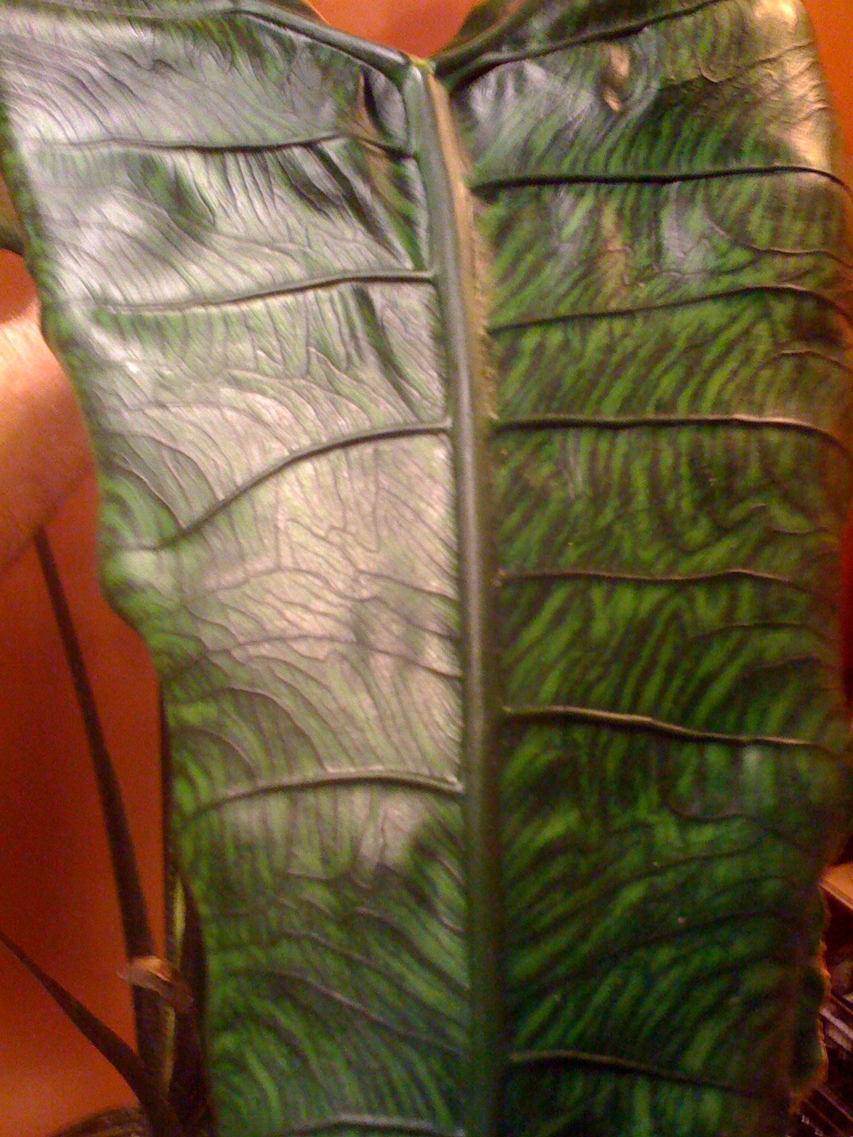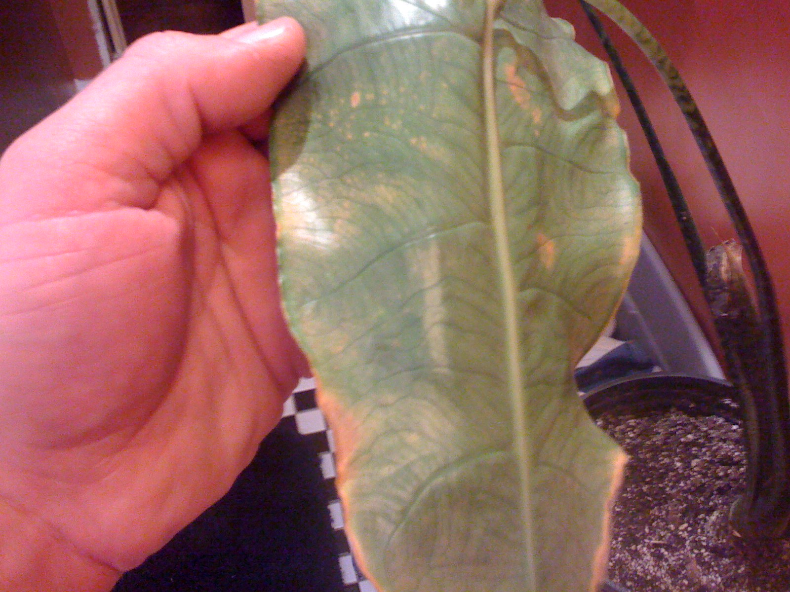 Hello All, I work in a high end retail garden center and we got in some beautiful alocasias that came in marked asst. exotic alocasias. I was thinking the larger one is reticulata (due to the discussion on here in early March). But it's aprox. 5 ft. tall and the flower smells like a fresh newspaper! the scent fills my plant room. I noticed it opened last night when I came home from work (close to 7pm) and there was no fragrance... this morning it is very fragrant....we'll see how it does the rest of the day (seeing how I have the day off today). Also does anyone know what is going on with the under side of the older leaves ?(tried to get a pic of it)