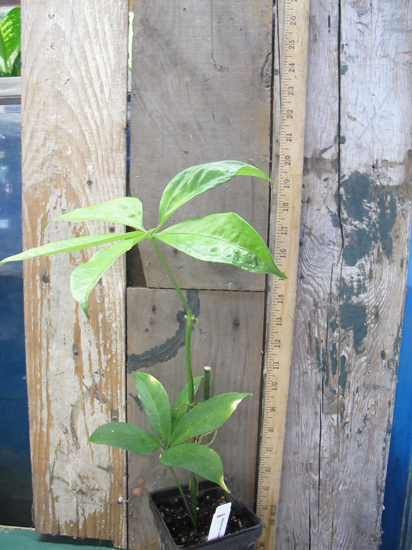 I know Amydrium zipp to have long, slender leaves, and was very surprised to receive a plant from Tropiflora that had fat / wide / broad leaves. The stem is clearly from older growth, but the leaves are so different.