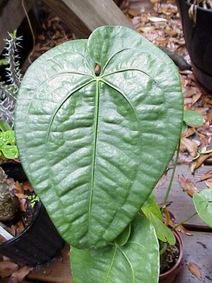 Hi Windy, I bought this plant from Tropiflora years ago that was tagged as A. rzedowskii, but quickly learned it didn't match the description of the true A. rzedowskii: http://www.aroid.org/genera/anthurium/belolonchium/rzedow.html Back then, I also asked on this list for help in identifying this plant. The only helpful response I remember was from Dewey Fisk (couldn't find it in the archives, may have been a private email) saying that this plant had appeared for sale from time to time under this name, and that they all originated directly from a grower in Hawaii. Unfortunately the nursery was unable to provide any helpful details on this plant's origin. Attached is a picture of my plant that sadly dropped dead for unknown reasons the year I purchased it. It was a very distinctive plant, with the overlapping lobes and thick bulate leaves held upward on long petioles. I have not seen this plant available anywhere since then, but hope to come across another to add to my collection. Hope this was of some help. Adam Windy Aubrey wrote: