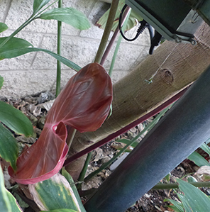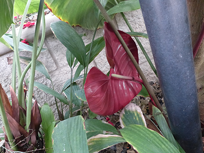 This is the second plant I'm trying to get an ID on. It's what looks like a philodendron with a pinkish-red leaf. One of the shots is taken at an angle. It was hard for me to tell, but it did look the leaf was on a plant that had other green leafs. The color, but not the shape of the leafs, reminded me of the picture of Philodendron lynamii that Enid has on her Natural Selection Exotics website.