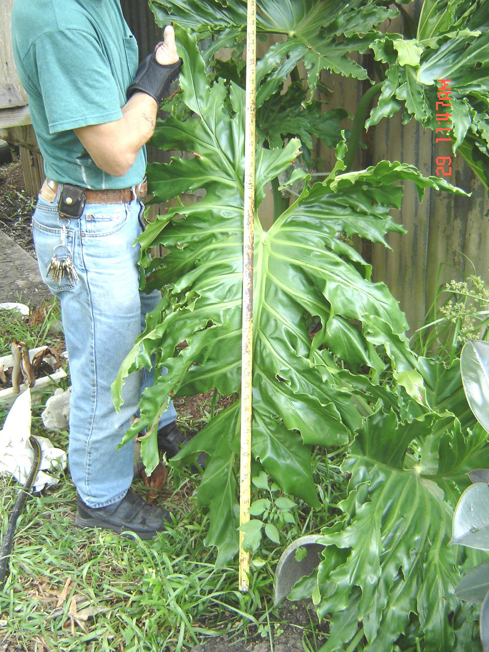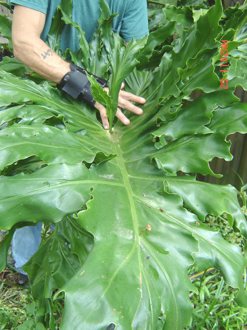 I have a large Philodendron selloum that I found hacked down on the side of the road last May. It was dark when I found it, so all I could tell immediately was that it was very big and had about a 4 1/2 ft. trunk. I brought it home and soaked it in a large wagonfull of water with Ironite, Superthrive, and a starter fertilizer (just a little weaker than they called for) for about 5 days, then we planted the stalk about 3 ft. deep. The entire plant is much larger than even the biggest P. selloums I've looked at, and I have done some serious looking! The leaves were over 50 in. long. and easily 36 in. across. The veins are larger, the flowers, the petioles...everything about this plant is much larger than others. Where the leaf meets the petiole (on top) there is a growth that starts out like a little pigtail, and grows into a strange leaf or plantlet or something. It has rooted since, but hasn't resumed growth just yet, but is definitely alive.