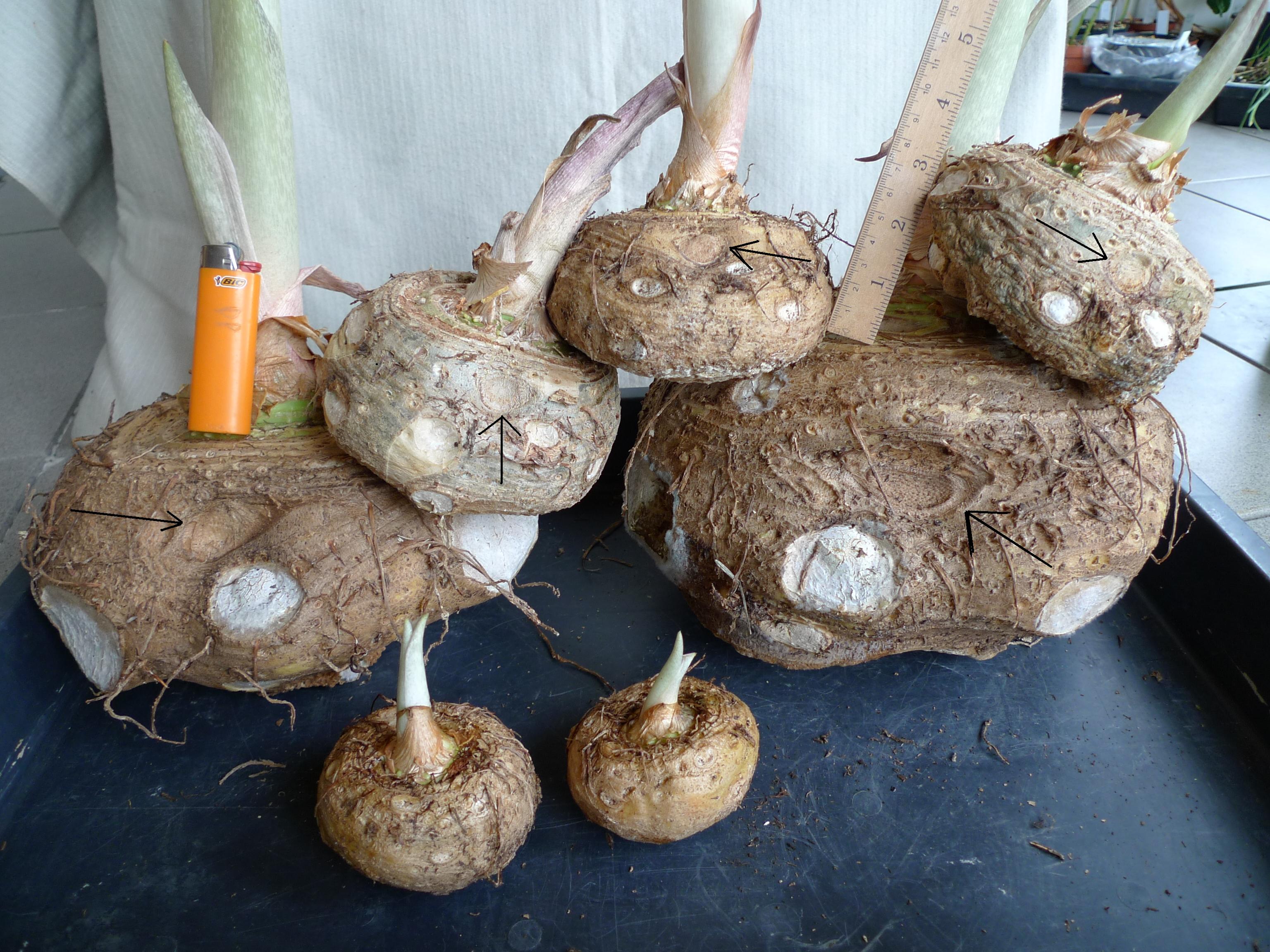 On the other hand there might be an indication that the offsets go back to buds that might be present on the tuber at the beginning of the new growing cycle and that those parts of the tuber are still present at the end of the growing cycle below the mark on the tuber (in other words: the old tuber is not consumed / replaced totally) - see post # 97 and picture 1 and 6 in post # 93.