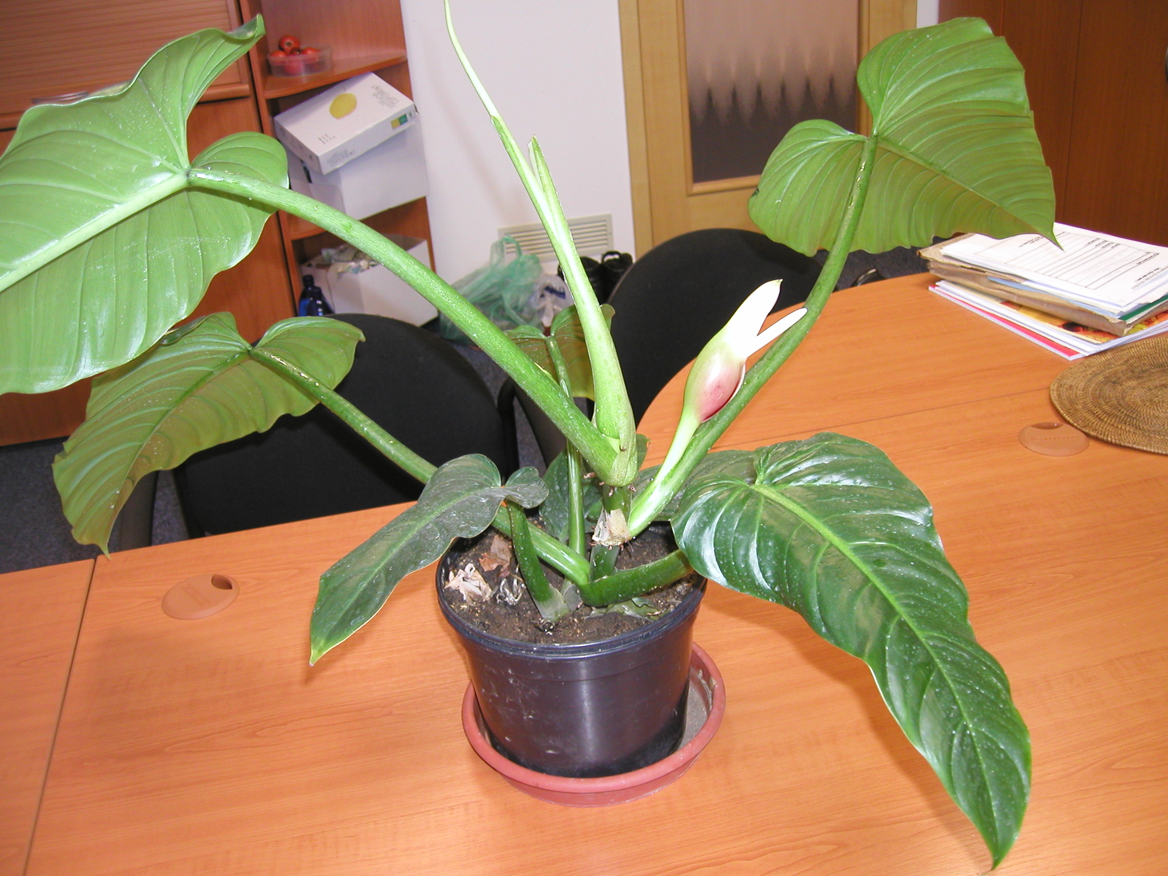 Subject: Philodendron sp. - identification excuse me for boring you with my problem: I am a Philodendron fan-amateur and I have been very pleased to see the inflorescence of one of my plants opened just now (I have them all in my office). Unfortunately am I unable to identify this species and this is why I send some photos to you. I do not know exactly, what is meant by "measures", but blades of biggest leaves are 50 cm in length and the inflorescence itself is app. 12 cm high (+7 cm peduncle). If any more information is needed, I will write it at your request immediately. With best regards Marie Dvořáková, Prague, Czech Republic.