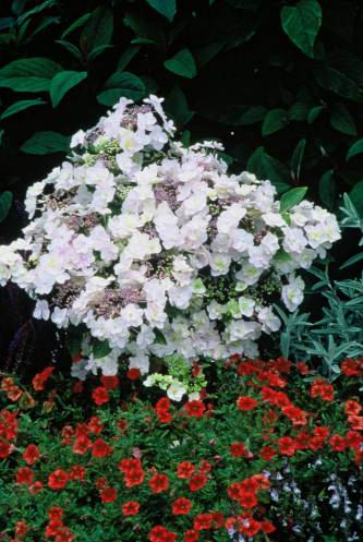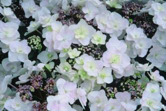 white-flowering hydrangea in his garden. It's a sport of Hydrangea Libelle