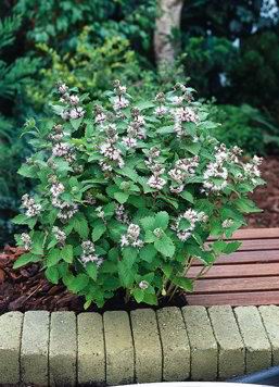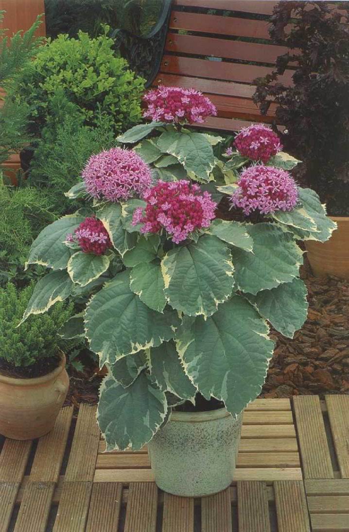 tolerant to high humid climates than clandonensis. The mature height is 24 - 30 inches. It's a welcome addition and color combination with the blue cultivars of Caryopteris. Clerodendrum bungei 'Pink Diamond' It's a very variegated Clerodendrum bungei type. The leaves show 4 different colors of green and white. The ultimate height is 30 inches. Pruning after 3 leaf pairs first appear and Pink Diamond will produce new shoots so you can sell a compact plant with 3 or more stems. The flowering starts with a red color and turns to pink later in the season. From the beginning to the end of flowering, you can enjoy this shrub for a period of 3 to 4 months. The plant does need pruning to produce the ideal selling shrub in one growing season. The plant is tolerant to sun and semi-shade. It is an ideal candidate for the container grown Patio Plant. Clerodendrum bungei 'Pink Diamond' is very fragrant and will attract butterflies to the large flower trusses. If you would