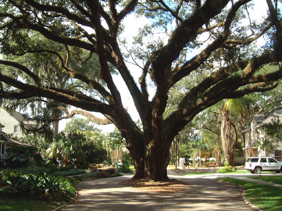 People in this part of Winter Park, Florida, saved this ancient live oak by building their homes around it and their road underneath its massive branches. Photo by Betty Mackey (http://www.mackeybooks.com )