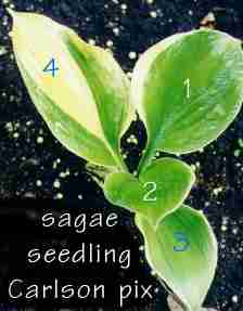 Notwithstanding, I am going to suggest some surgery to your plant: Theoretically & hypothetically speaking; if for example, you were to cut off leaves 1 2 & 3 (as close to root base as possible) leaving the desired leaf in tact (leaf 4) and staking same to avoid breakage ...my thinking, leads me to believe, that the auxillary bud under that desired & prefered leaf-stem will develope more quickly, and eye development will move in that direction. In late summer, you may have a bud large enough to isolate properly (bud cut?) and or, next year's resulting plant may have all it's leaves having the wanted medio factor on all leaves. [see image attached "sagae seedling 1.jpg" to see what we're talking about?]