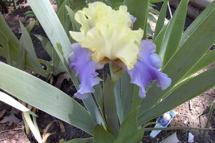 "S. yellow; F. violet, edge lighter; beards yellow, mustard in throat; ruffled; slight sweet fragrance. Edith Wolford X Helen Wanner. Evelyn Kegerise 1993."