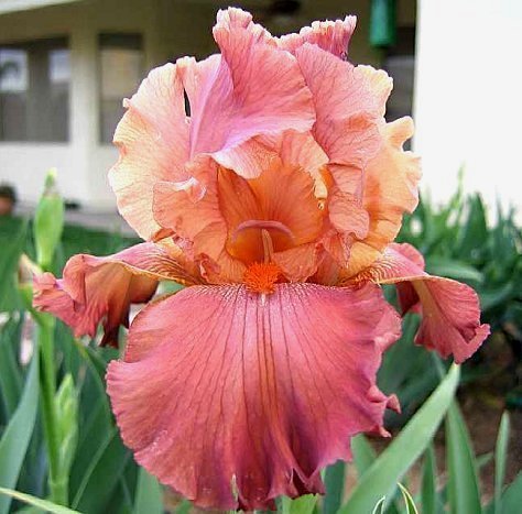 sandstone red (RHS 178B), edges lighter, violet central infusion; beards
