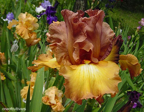This iris was identified as perhaps an up an comer by Walter Moores. Here it has turned out to be just that. Strong, tall, stalks with well spaced branching and an uncommon color combination for a reverse pattern. Too, it has produced at least one reblooming seedling. Increase 6x.