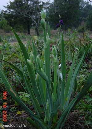This photo is from a few days back. DS is now showing color. This is a single stalk. The bud cout is nine or more though all do not show in the photo. Contrary to current vogue I find myself wishing for more irises having branchs that eminate from points low on the stalk. I do not often stick my irises in a pipe but look at them each day.