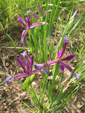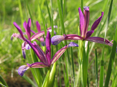 Iris brandzae or Iris sintenisii ssp. brandzae ,take your split. A very narrow leaved species from Romania. Quite happy in full sun with sharp drainage. Faint scent and I have a keen sense of smell. Maybe it's better during the heat of the day! In person the narrow falls are spectacularly marked, a markedly different pattern on both the top and the bottom sides, the style arms cover up a lot of detail. I have only one clone and so far it has not set seed. It blooms much too early to cross with other spuria species. It does look cute in the photos, but, definitely a collectors plant. No real impact in the garden with flower height at only six to seven inches and foliage a tad taller. Difficult to keep weeded as the foliage of this iris does look like grass when not in flower.