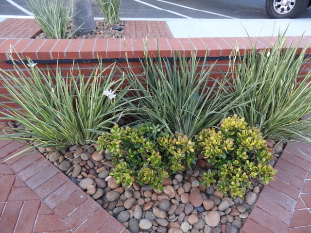 Just thought I'd share a couple of pictures I took on my walk to work this morning. I am embarrassed to admit that I walked past these sidewalk plantings for about a week thinking the plants were a dwarf Phormium cultivar until I noticed white buds a few days ago. The first flowers on this flush of bloom just opened today.