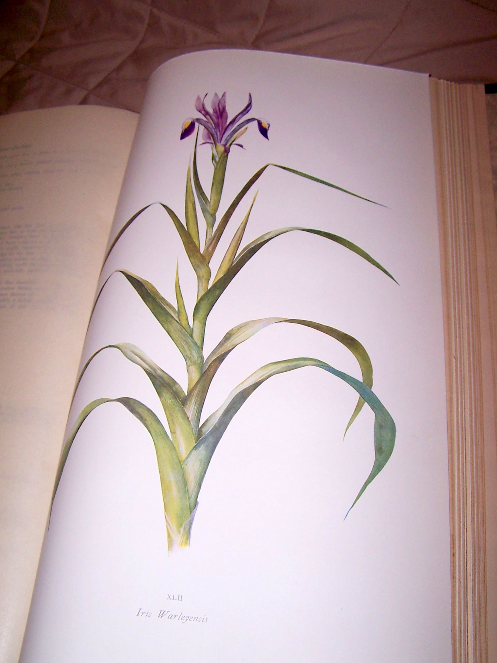 Hi Dave,Here are some pictures, all the plates are intact with their cover tissue and I don’t see any foxing, binding is tight, there is gold on the top of the page edges but nothing on the side or bottom pages.JillFrom: s*@molalla.netSent: Sunday, June 23, 2013 12:20 AMTo: j*@frontiernet.netSubject: Re: The Genus IrisWould very much like to see pictures of the volume.Dave SilverbergLibrarianAmerican Iris Society----- Original Message -----From: j*@frontiernet.netTo: s*@molalla.netSent: Saturday, June 22, 2013 5:24 PMSubject: Re: The Genus IrisHi.it’s in great condition- not sure what to ask- I’ve seen $800-1200.00. It’s been sitting in a drawer forever, so someone may want to enjoy it. I can send pictures if anyone is interested.Best Regards,JillFrom: s*@molalla.netSent: Saturday, June 22, 2013 10:16 PMTo: j*@frontiernet.netSubject: The Genus IrisMs. Reed: What is the condition of the book and what is your asking price.Dave SilverbergLibrarianAmerican Iris Society