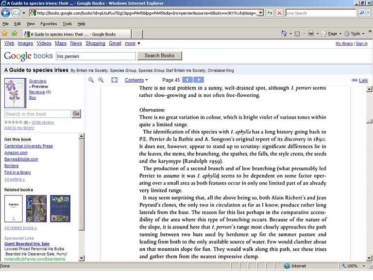 I did a screen capture of the page from Google books review of "A Guide to Species Irises" by the British Iris Society and attached it to this e-mail. Apparently, forms with branching from the base do exist in one small part of perrieri's limited range and because of accessibility issues, these forms are what have been collected and distributed. This has lead to a mis-association of perrieri with aphylla, and also to the the confusing mismatch between recorded description and plants in hand.