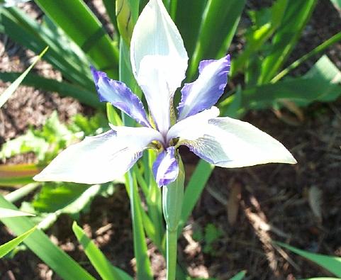 Both standards and style arms are white with 1/4" borders of a medium blue. The standards are white with a rim of light blue. Light blue lines radiate from the throat for 1/4 of the falls.