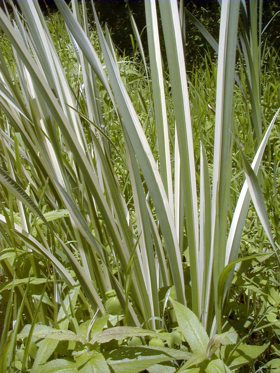 Could it be Acorus (Sweet Flag) variegata? I have one that looks a lot like that, and of course the Iris pseudo-acorus is named for its resemblance. The variegated Iris p. that I have seen is striped with yellow. Joan Cooper