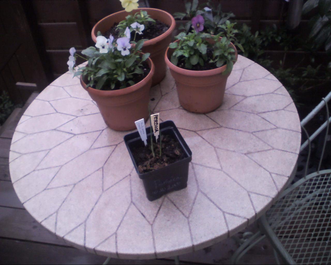 I don't do much for these except hover over them and give them a splash of very dilute balanced Miracle Gro when I wash out the pot that held the stronger solution for the Hellebores. Last year my seedling stayed on the table on the deck except when it got so cold I actually shut the door to the tiny plastic cold greenhouse, then I tucked it onto a shelf therein. I did not fear cold as much as I feared wind and dessication. This is not the original pot. A very look root emerged llast spring from the smaller pot in which it germinated and I thought I needed to pot up, so simply turned out the clump and placed It into this pot, filling in around the edges. The very long root turned out to be a seedling of one of my cutleaf Japanese violets which come up everywhere.