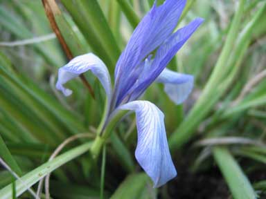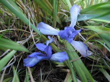 This is the third year in a row for three different clones of Iris lactea to re-bloom. If you got the pictures you can see why I'm not too excited. Although they have been blooming for two weeks with a few flowers every day the stalks are only one or two inches tall while the foliage is about two feet long and splayed over the flowers. The pix were taken in low light and look much too blue. These plants were grown from wild collected seed and have been in the same spot six or seven years. These clumps are quite large, easily over eighteen inches at the base.