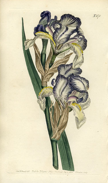 One thing interesting about the name "aphylla" is that it has been applied to several Iris species and forms. In the nineteenth century literature, for instance, we even see things described as "aphylla" just because they have the same color pattern as the plate in Curtis's Botanical Magazine, which is what we now call "plicata." William Dykes in The Genus Iris, 1913, reminds us that the aphylla "of gardens" is not necessarily the same as the species as we understand it. I need to write an essy on all this at some point, or maybe someone else will. But if you read someone from before WWI talking about "aphylla breeding" they may be taking about working with plicatas.
