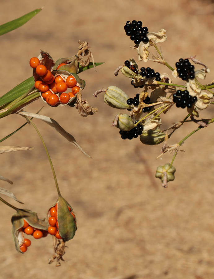 As far as I know, Iris foetidissima with its orange seeds and Iris |