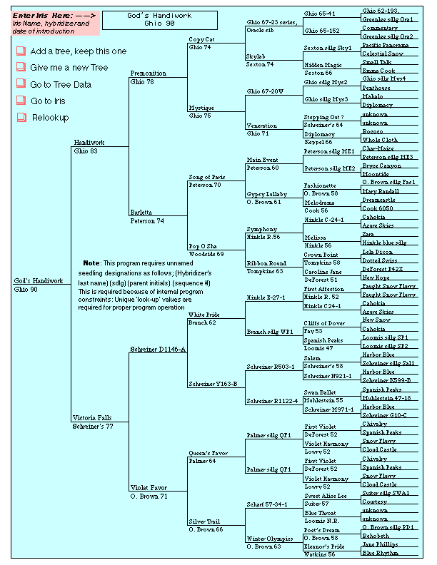 Hi Jan >,,,pedigrees for it's parents: God's Handiwork Attached as a gif, filename: Gds_hnwk.gif Use your internet browser to open the gif. Go to 'open file' on the menubar, when you get the open dialog box navigate to the directory where your email client saves attachments, and open the gif Cheers Mike