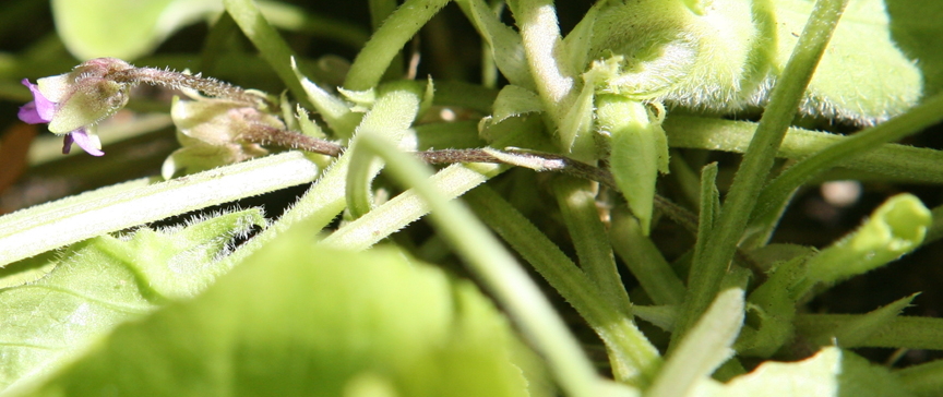 Subject: request for info on SC violets ![]() The Laguna Creek (or Bonny Doon Ecological Reserve) form of the Santa Cruz Mountains violet is currently producing a few semi-chasmogamous flowers. It can be seen in the JPG that the fuzzy bractlets are far removed from the flowers and that the stems are complicated. A further suggestion that the various Santa Cruz Mountains violets are all of the same kind of animal is that even semi-chasmogamous flowers are fragrant. It has been suggested that Santa Cruz Mountains violets are planted and are the work of an unknown hybridist. However, what manner of hybridist would spread such a shy-flowering violet around, especially, in places where no one would see it? Does anyone know of anyone who might know about occurrences of Santa Cruz Mountains violets in places other than (1) east of Boulder Creek, (2) the vicinity of the Bonny Doon Ecological Reserve, (3) UCSC? |