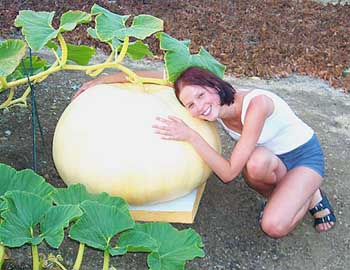 Ina hugs Iggy - a 245 pound experimental pumpkin