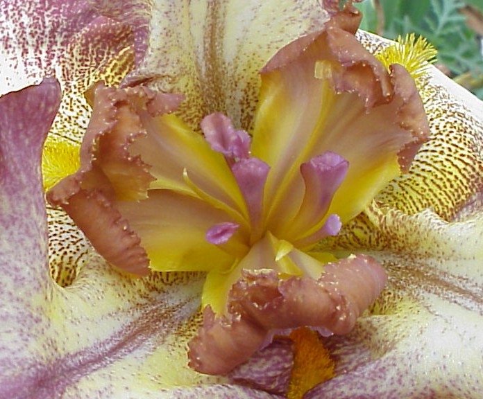 For several years now I have been watching closely inside iris blooms for petals down in the styles. Having spoted them in seedlings I then read somewhere that some of Keith Keppels plicatas had these little apendages. I have sence found them in other irises such as Coming Up Roses, Designing Woman, in my introduction Comfort Zone, etc . My best SA so far that has them is Navajo Code that will come out in 2006. In the cultivars just mention they appear one each between the style arms. I other iris they come in pairs or multiples. The attached photos of the cultivar I have nicknamed Style Spray show six total style petals. The size of the petals have been increased by doing a self cross of one of my plicata seedlings that exibited the style petals. Style Spray (P5-10Avhss (Ominous Stranger X Chiffon Ruffles)). see attachments